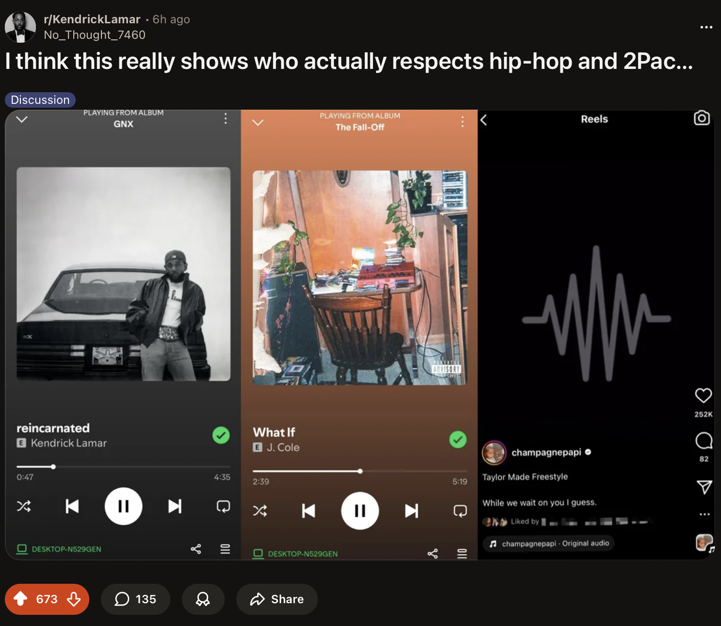 Screenshot from Reddit comparing each of the Big Three’s use of 2Pac in their music
